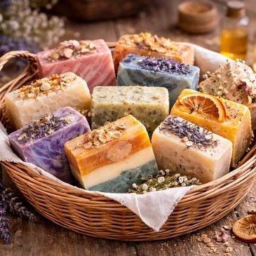 Our soaps are all hand crafted with thoughtfully chosen ingredients which may include: Saponified oils of palm, coconut, sunflower, olive, avocado, shea, and castor seed, as well as natural fragrance and essential oils, mica coloring, activated charcoal and titanium dioxide for coloring